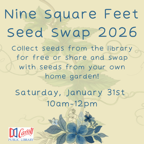 This event is taking place across the state to share a love of gardening and support home gardens. This will be the third year that the Carroll Public Library is participating, and you can be a part of that, too! Each adult attendee can select FIVE free seed packets (children under 12 select TWO free packets).