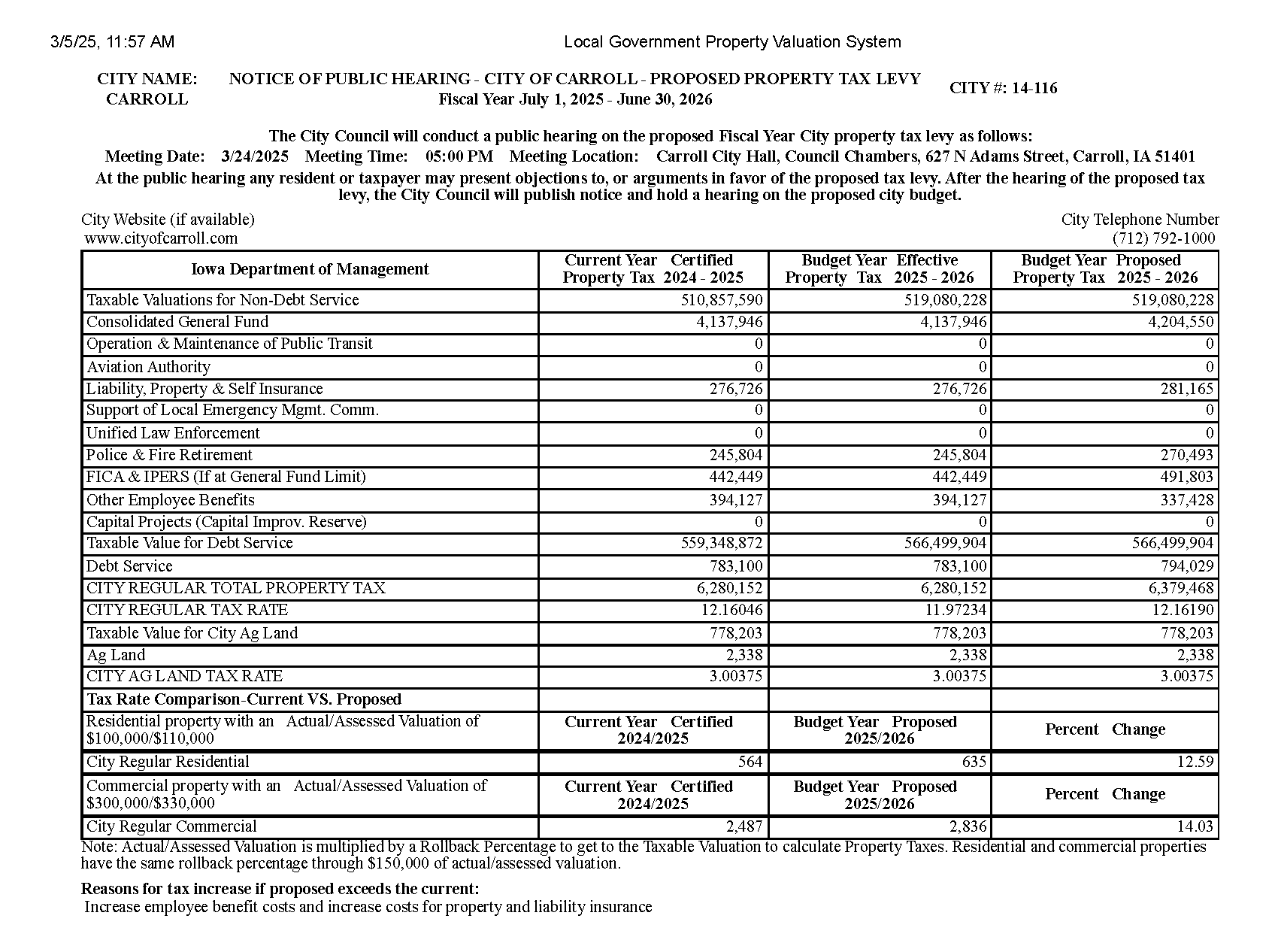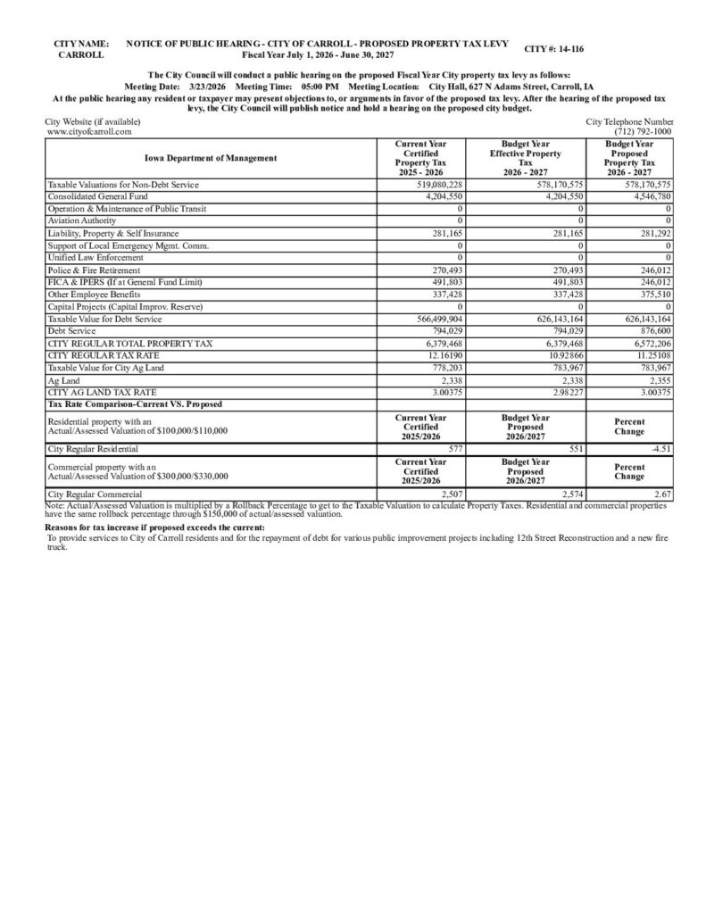 City of Carroll F.Y. 2025/2026 Hearing Notice