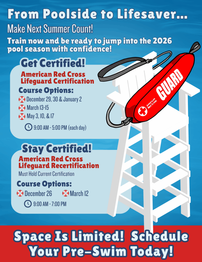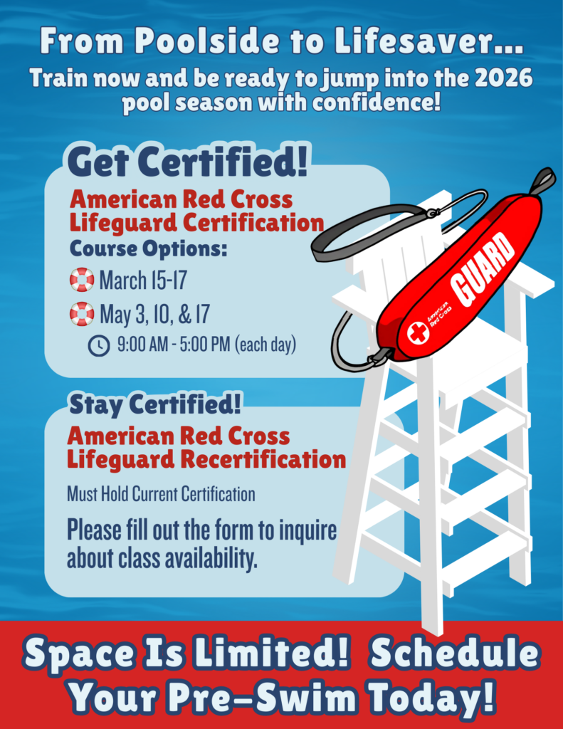 The Carroll REC offers 2–3 American Red Cross Lifeguard Certification Classes each year. These courses are typically offered in a blended learning format, which includes: