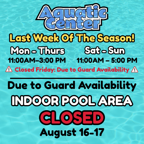 Adjusted Aquatic Center Hours (Beginning Aug 4) Monday–Friday: 11:00 AM – 3:00 PM Saturday & Sunday: 11:00 AM – 5:00 PM
